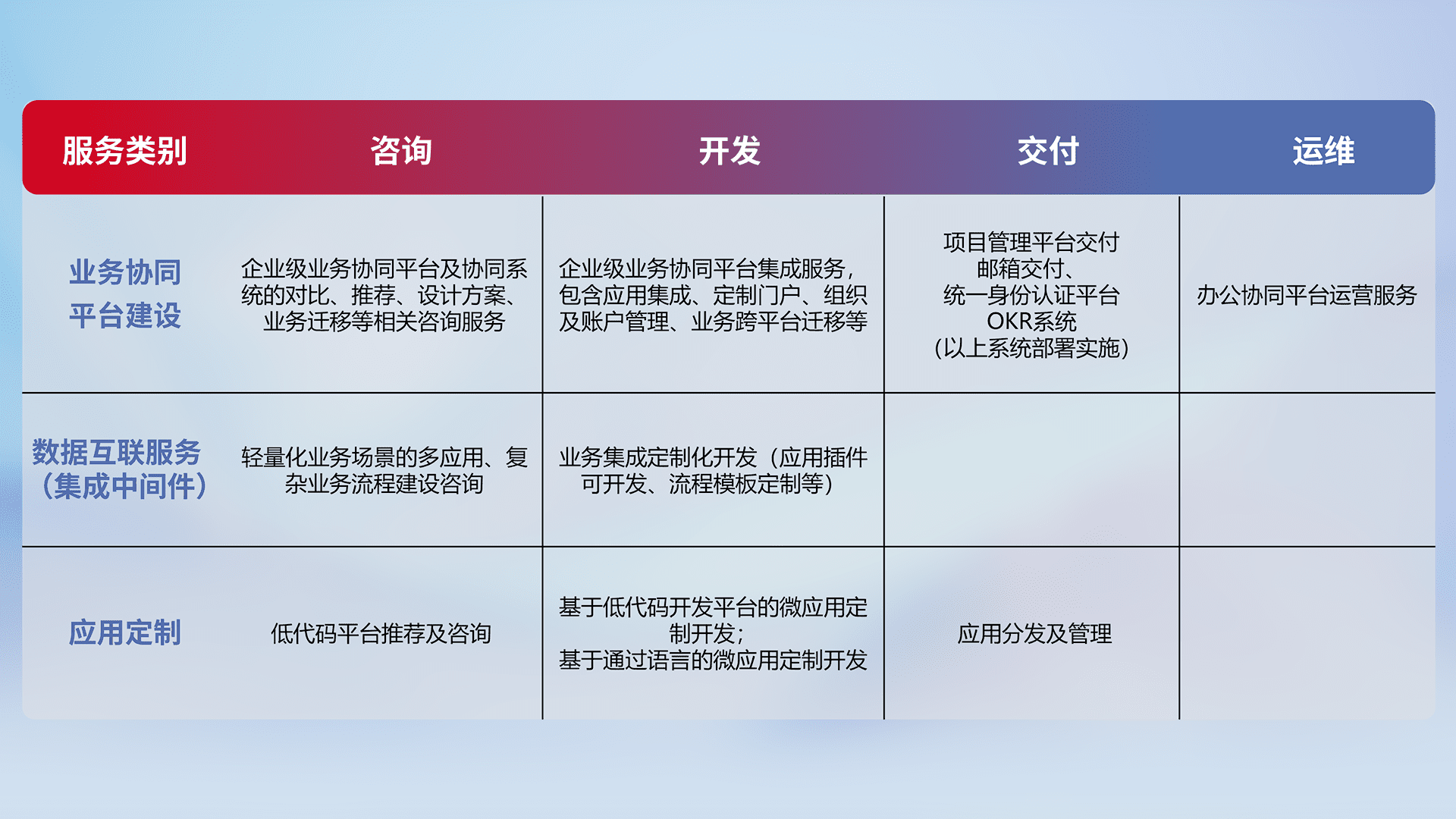 针对钉钉、、、、企微、、、、IDaas等平台级产品提供产品的规划、、、、方案、、交付、、定制化开发等服务,,,实现如统一协同办公、、智能客户服务、、、、混合会议管理、、、、智能数据查询、、、、等业务场景,,,实现数字化转型。。